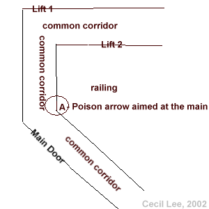 1. the narrow corridor where the lift faces the main door. This is Sha Qi and can be cured with two plants placed strategically at the location.